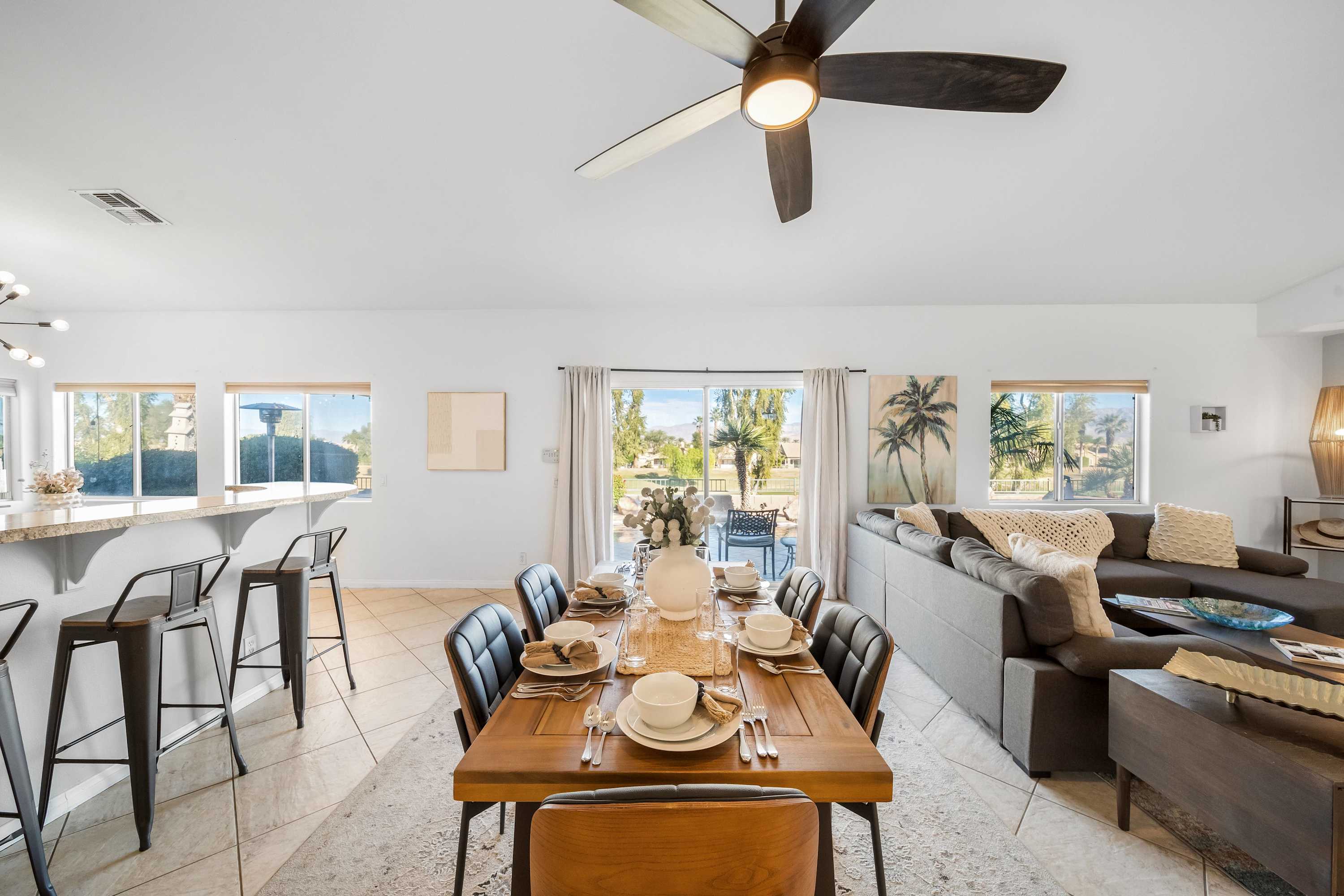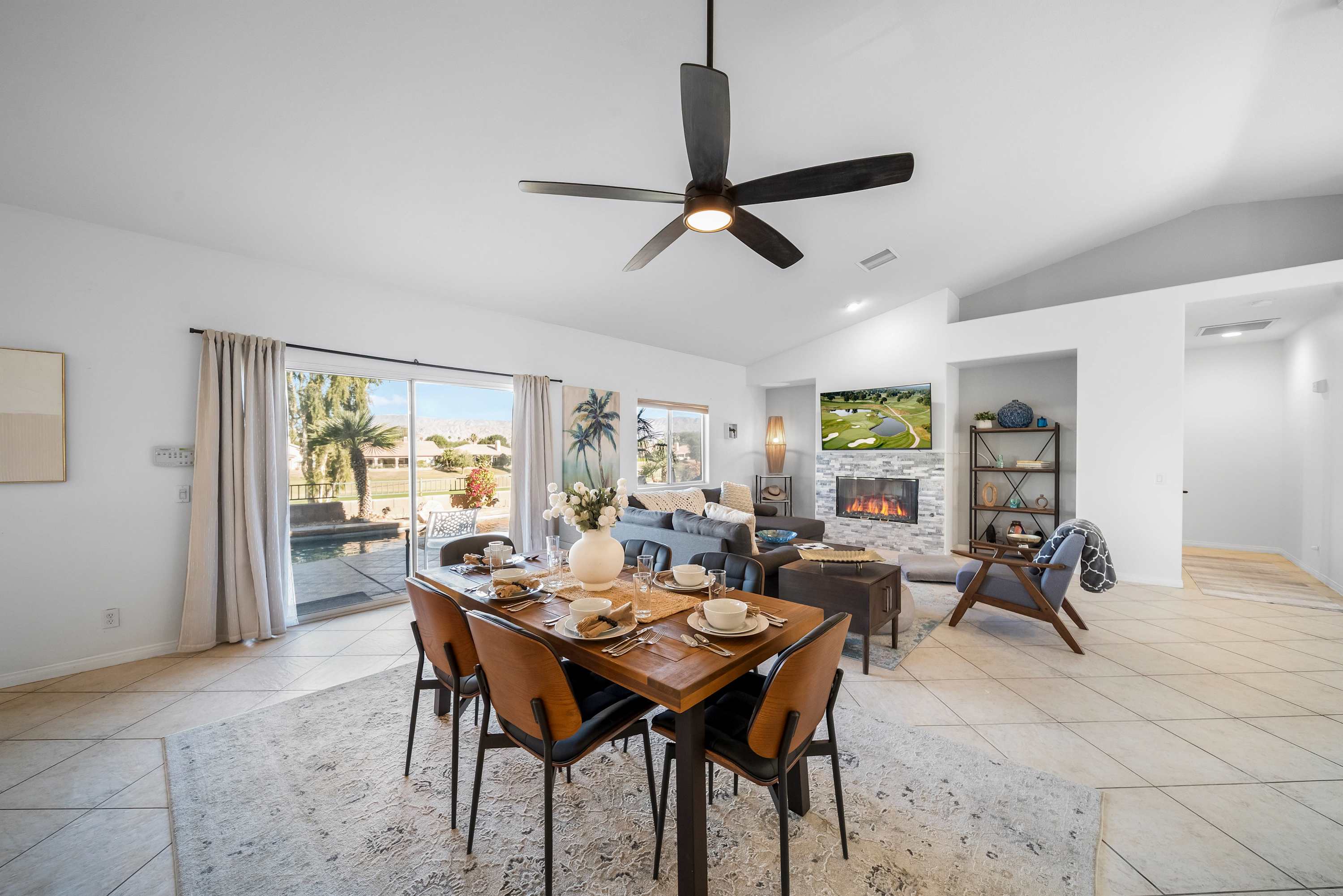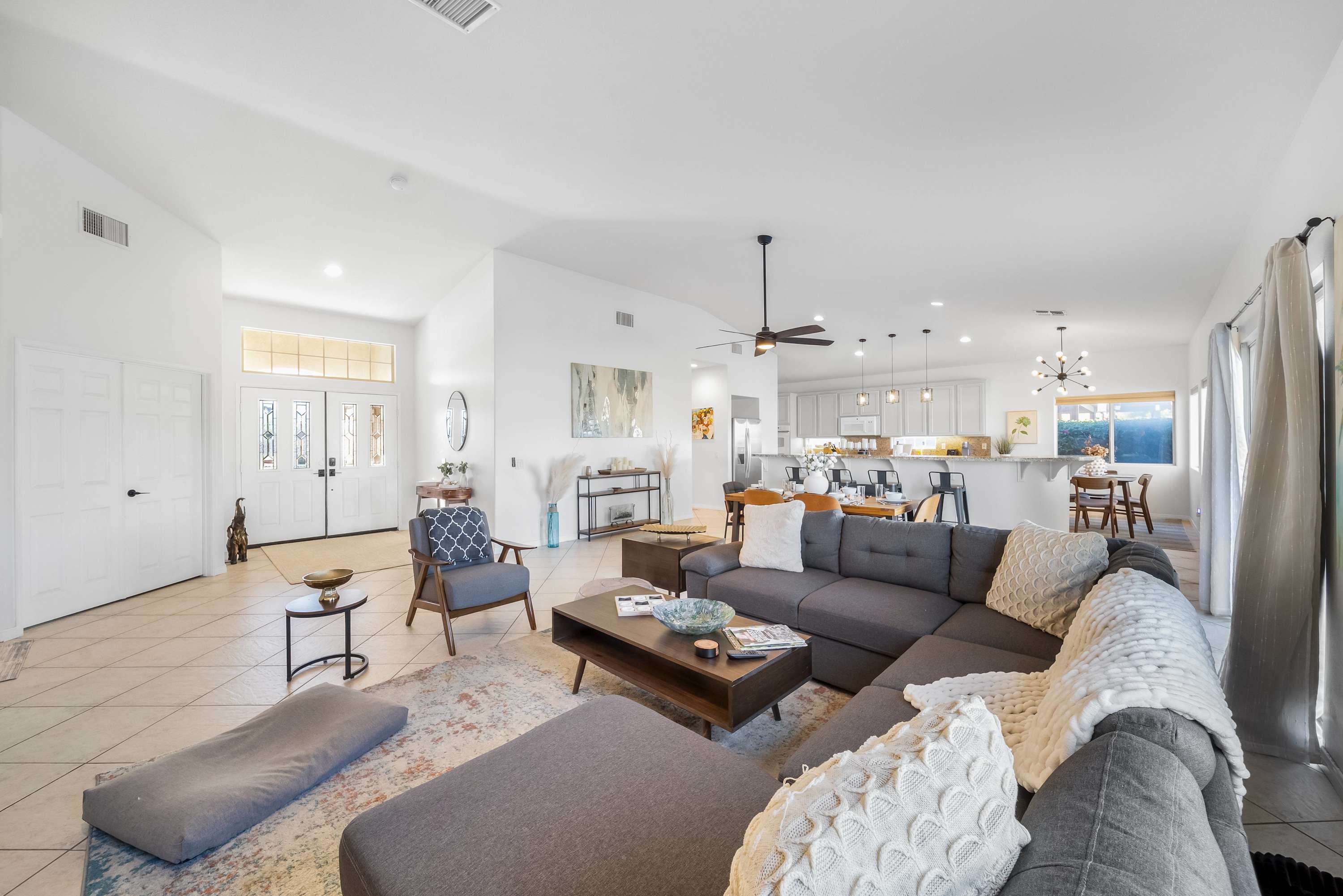 Sunlight pours into the main living area the moment you arrive, revealing an open, spacious layout that’s effortless to settle into. The open layout makes it easy to move through the home, with generous room to relax, work, or entertain. The space adapts easily to different needs—some days it's a place to unwind, other times it's ready for hosting and connection. The kitchen is well-equipped with modern appliances, ample cabinet storage, and a convenient breakfast bar. It’s set up for everyday cooking, with enough openness to stay connected during conversations or casual meals at the counter. Positioned next to the kitchen, the dining area offers a relaxed setting for shared meals or weekend brunches. The primary bedroom is set apart from the others, with its own en-suite bathroom that adds a bit of privacy and ease. It’s well-suited for someone looking for a personal corner to recharge. The three additional bedrooms are generously sized, offering flexibility for families, visiting guests, or anyone needing an office. The layout works well for longer stays, giving everyone enough space to spread out. Step into the backyard and you’ll find one of the home’s best features—a private outdoor space with sweeping mountain views and a wide-open desert sky. It’s a great spot for slow mornings, dinner outside, or evenings under the stars. An attached garage offers secure parking and additional storage—useful for keeping things organized. The home is also situated close to parks, schools, shopping, and local dining, making errands and outings easy to manage. And with Coachella Valley’s entertainment and outdoor attractions just a short drive away, there's always something nearby to explore.
