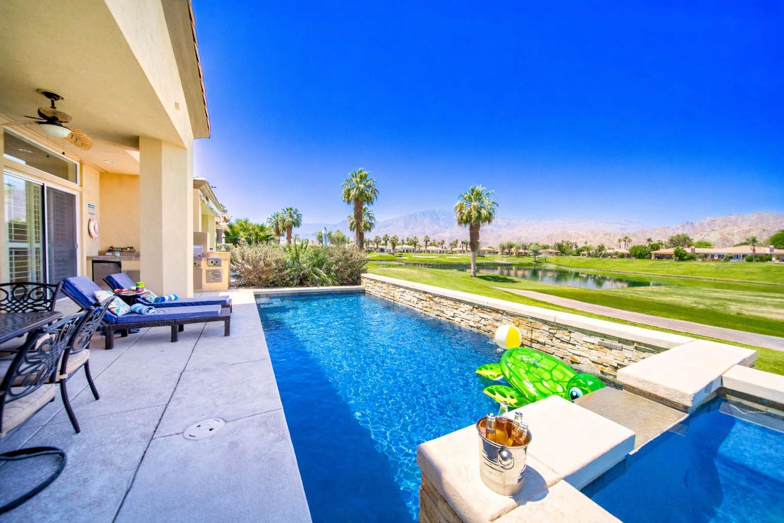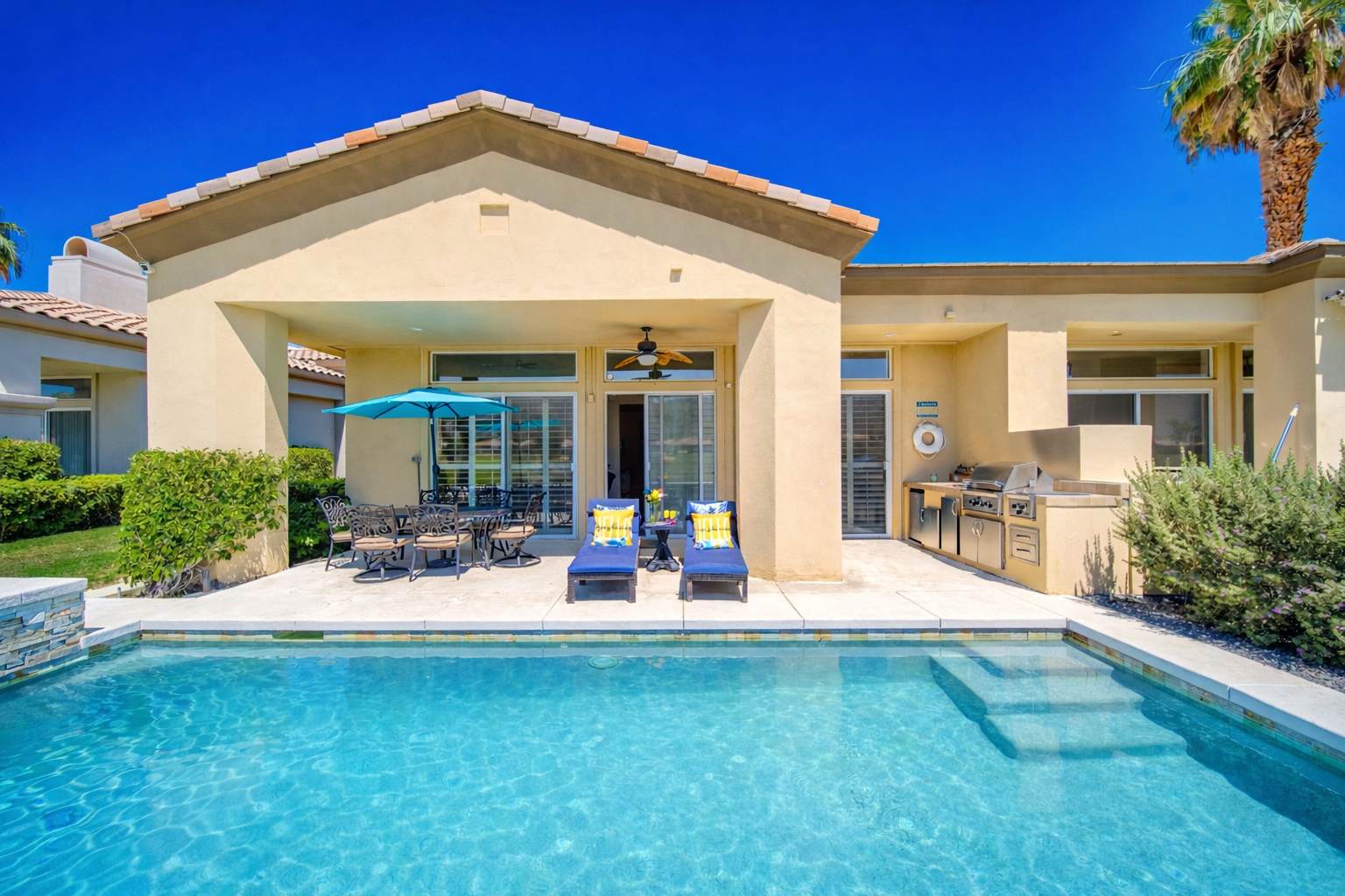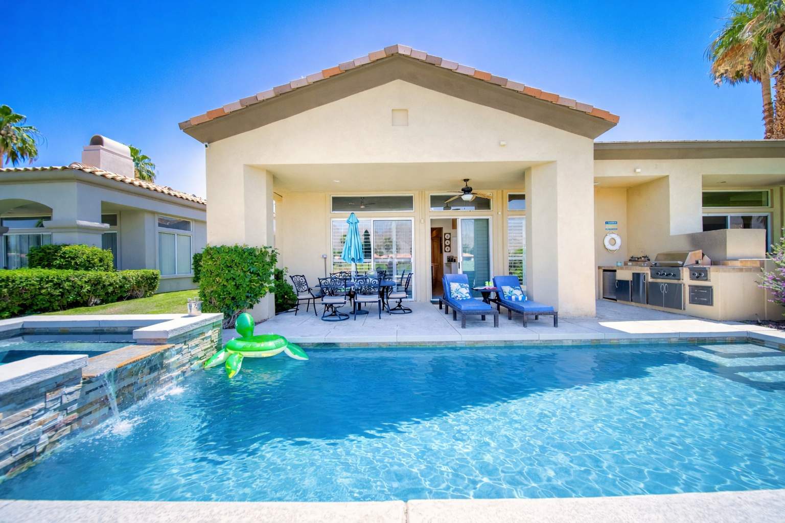 Welcome to Casa Isla Oasis, where serene desert landscapes meet shimmering lake views and glowing Santa Rosa Mountain sunsets. This thoughtfully designed retreat features soaring ceilings, an open-concept layout, and seamless indoor-outdoor living—ideal for families, couples, and luxury travelers alike. Unwind in style or spark friendly competition in the fully equipped game room, complete with arcade games, shuffleboard, and air hockey—perfect for all ages. Living Room The inviting living space is designed for comfort and connection: ✔ Plush seating for lounging and conversation ✔ Flat-screen TV for movie nights ✔ Wet bar for cocktails and entertaining ✔ Open layout flowing into the dining area and kitchen Bedrooms & Bathrooms Thoughtfully arranged for privacy and comfort: ✔ Primary Suite: King bed with en suite bathroom ✔ Guest Suite: King bed with en suite bathroom ✔ Bedroom 3: Three beds—ideal for families or groups ✔ Additional full guest bathroom Backyard & Outdoor Living Step through the glass sliders into your private desert oasis, designed for relaxation and entertaining: ✔ Pebble Tec pool with raised spa and soothing spillover feature ✔ Chaise lounges for sunbathing ✔ Covered patio with outdoor dining and seating ✔ Custom-built BBQ station with bar, mini fridge, sink, and prep area Optional pool heating available for $75/day upon request. Golf Cart & Parking A golf cart is available to rent for the entire stay only (refundable deposit required) at $35/day. Bikes are also provided for exploring PGA West at no cost. ✔ Garage parking for 1 vehicle ✔ Driveway parking for 2 vehicles ✔ Street parking for 1 vehicle (HOA rules apply—no blocking driveways or mailboxes) Guests may play three public PGA West courses; remaining courses are private and reserved for members. Community Amenities Included with your stay: ✔ Access to community pools & spas Member-only amenities (not included): ✔ Clubhouse & fitness center ✔ Tennis & pickleball courts Important Notes ⚠ Quiet Hours: 10:00 PM – 7:00 AM (PGA West community rules) ⚠ Golf Course Access: The course is private and may not be accessed through the backyard ❌ No parties or events ❌ No smoking ❌ No pets ✔ Guests must adhere to the reservation’s maximum occupancy. Unauthorized additional guests may result in fees or cancellation.